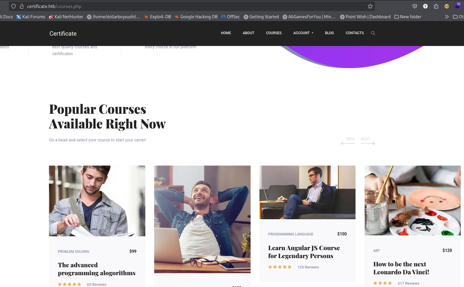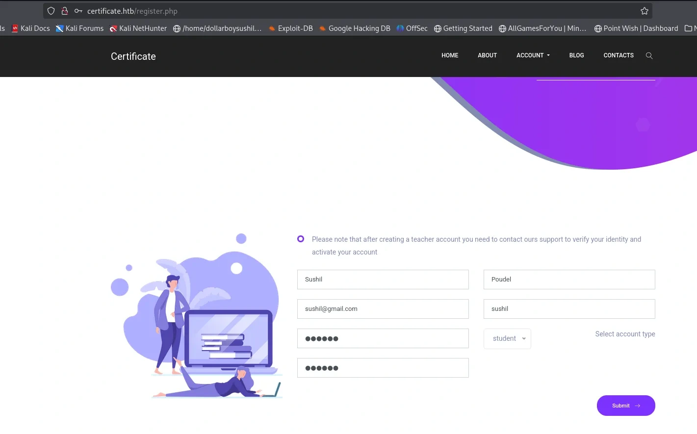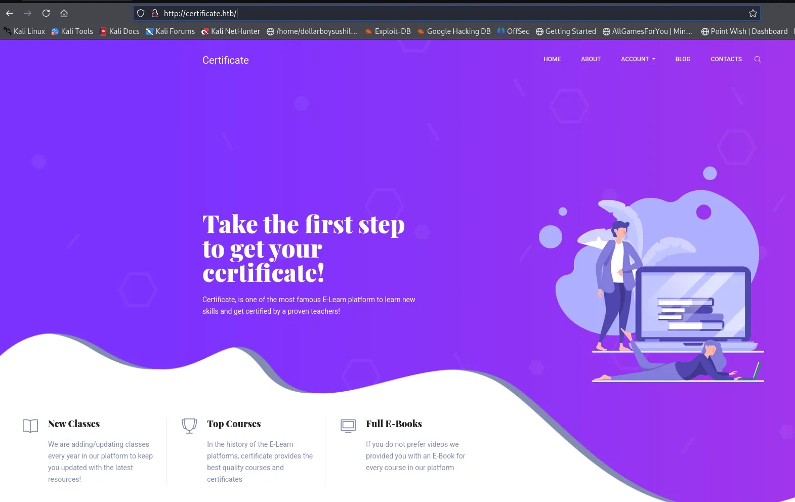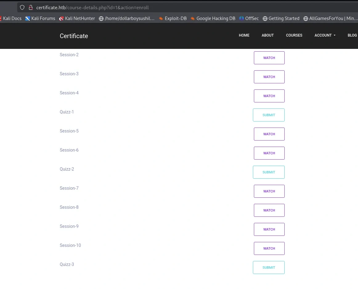 Website certificate.htb is some kind of learning management system. This site has register and login feature, so lets create account and login.