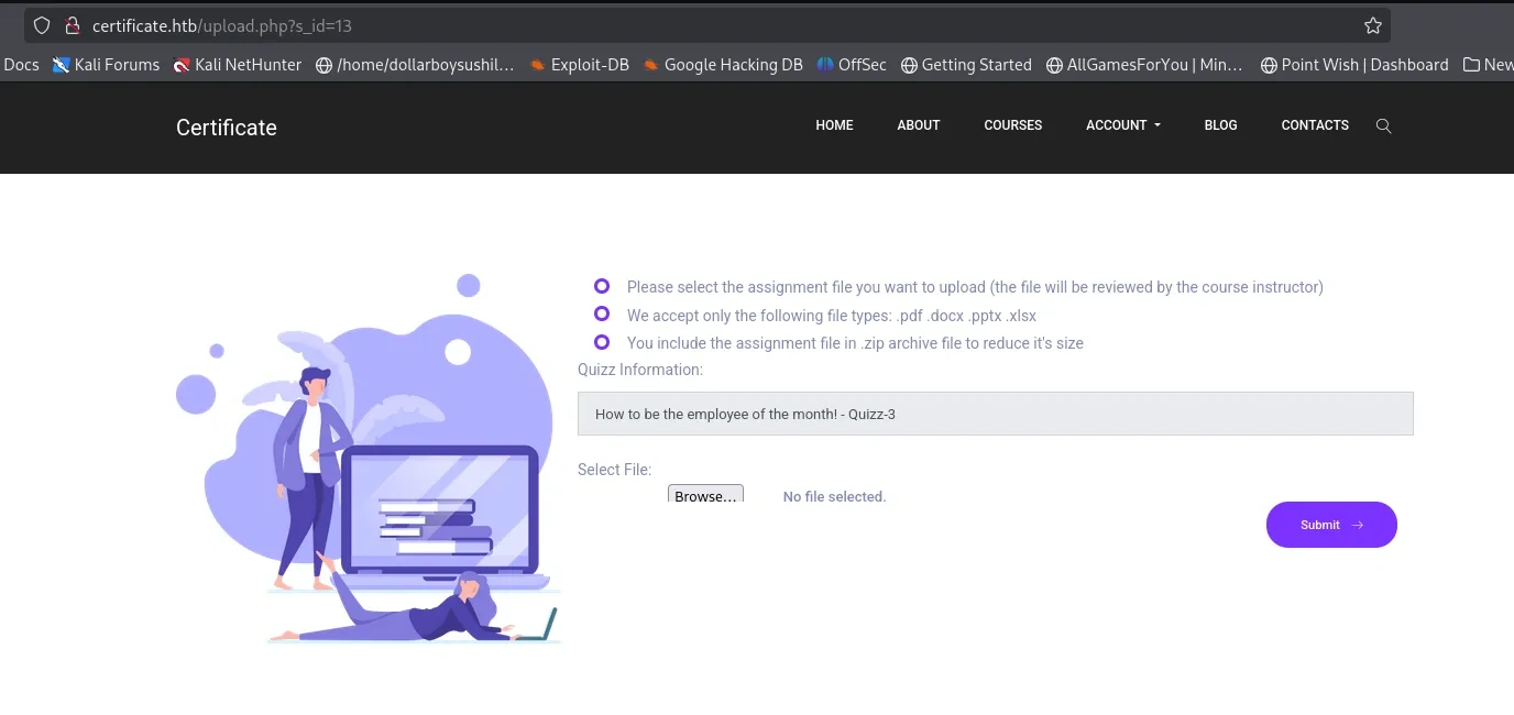 After enrolling to any of the courses, we have option to upload and submit assignment. (Maybe file upload vulnerability.)