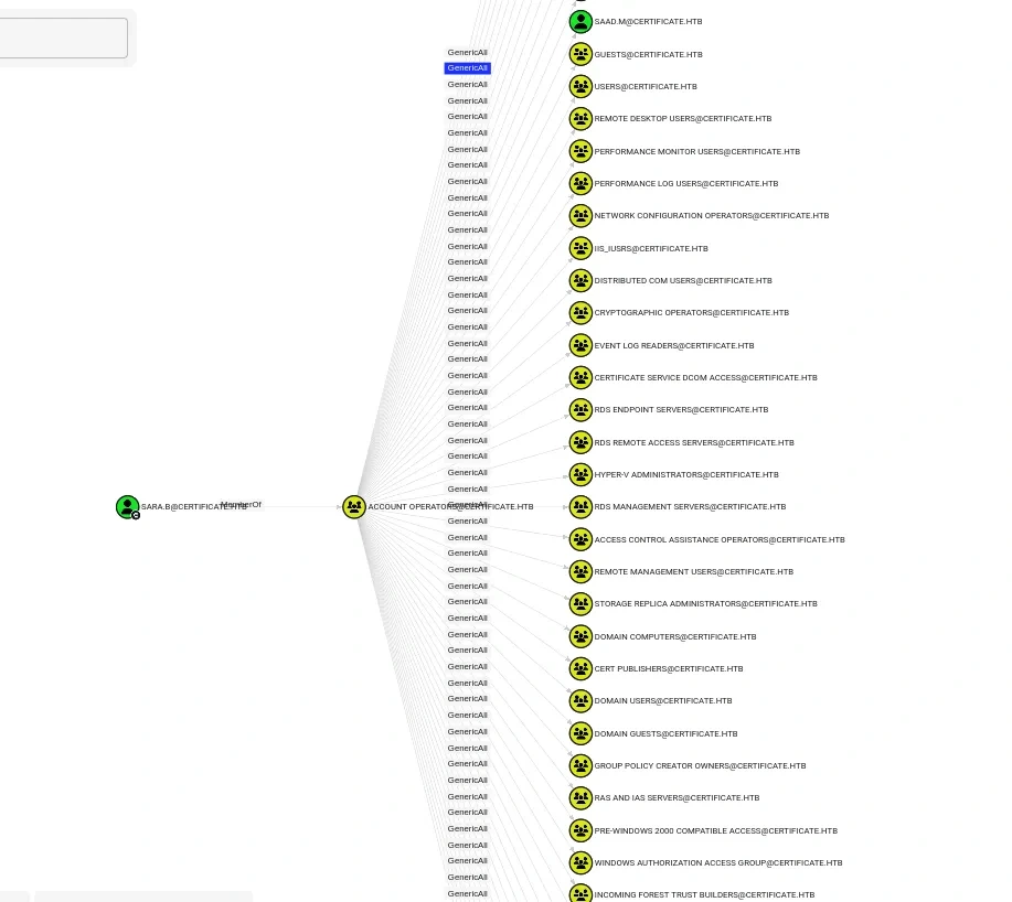 After little bit exploration in Bloodhound GUI, we can see user sara.b has generic all permission over tons of object.
