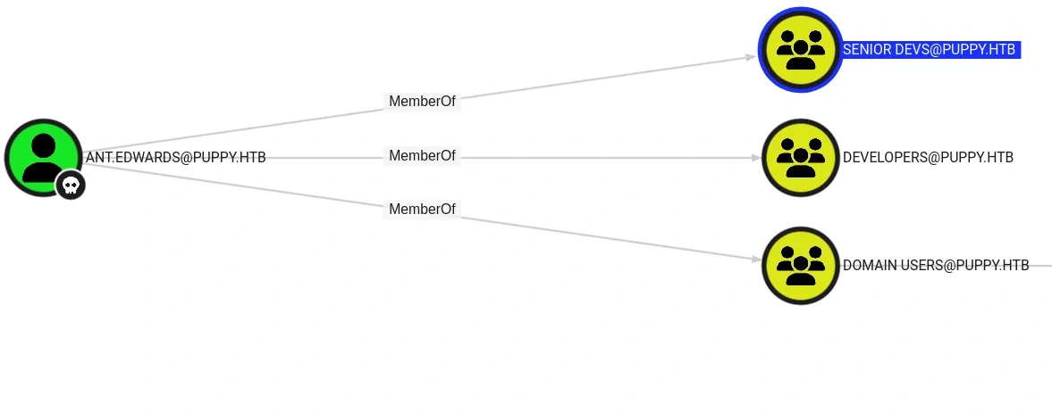 In the bloodhound gui, I found user ant.edwards is member of Senior devs group.