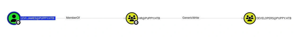We can see user levi.james is member of HR group and HR group has GenericWrite permission on Developers group.
