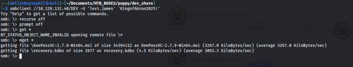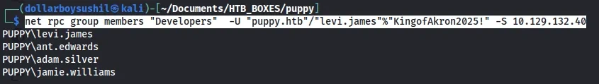 net rpc group members "Developers" -U "puppy.htb"/"levi.james"%"KingofAkron2025!" -S 10.129.132.40