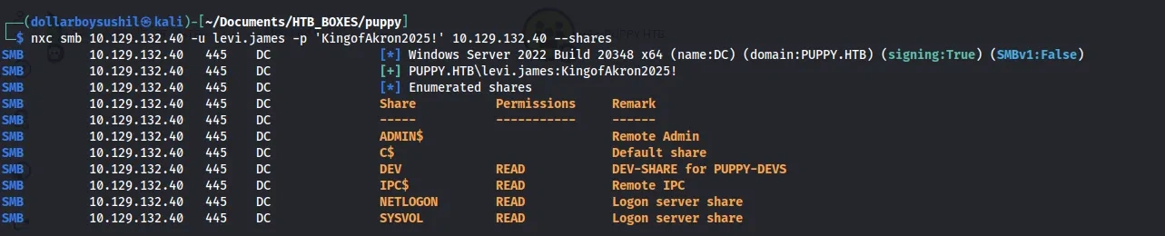 After this, if we check the share permission, we now have read access to DEV share on which we didnt have read permission before.
